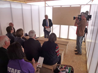 The Dewi-Prys Thomas Prize scheme for 2012 was launched by Lord Dafydd Elis-Thomas at the Architecture Pavilion, National Eisteddfod of Wales, Vale of Glamorgan at midday on Sunday, 5 August 2012 (see photograph). The Trust is grateful to all those who attended, and thanks to the Royal Society of Architects in Wales for the use of the pavilion and BBC Cymru/S4C for their television coverage.